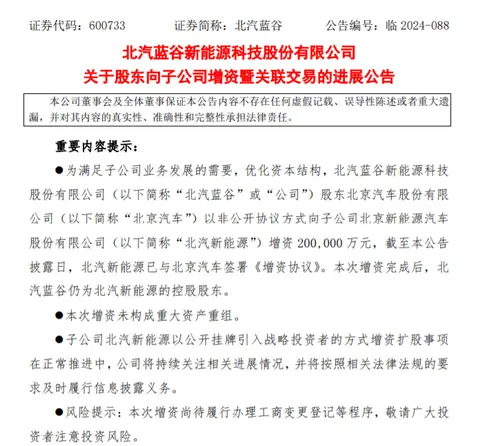 12月24日晚,北汽蓝谷(600733.SH)发布子公司北京新动力汽车股份有限公司(简称“北汽新动力”)增资扩股发达公告,把柄公告,北汽新动力引入11家计谋投资者并签署了《增资公约》,总共取得增资81.5亿元,而本轮增资完成后,北汽新动力的控股鼓吹仍是为北汽蓝谷。