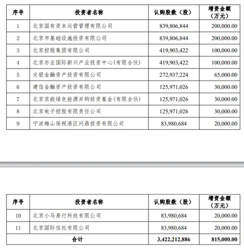而这次入局的11家计谋投资者分裂是北京国有老本运营处理有限公司、北京市基础才智投资有限公司、北京控股集团有限公司、北京亦庄外洋新兴产业投资中心(有限合股)、交银金融钞票投资有限公司、建信金融钞票投资有限公司、北京京能绿色动力并购投资基金(有限合股)、北京电子控股有限株连公司、宁波梅山保税港区问鼎投资有限公司、北京小马易行科技有限公司以及北京外洋信赖有限公司。