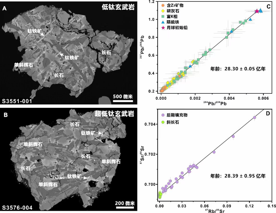 △嫦娥六号月壤中的两类玄武岩(低钛和超低钛)以及低钛玄武岩同位素等时线