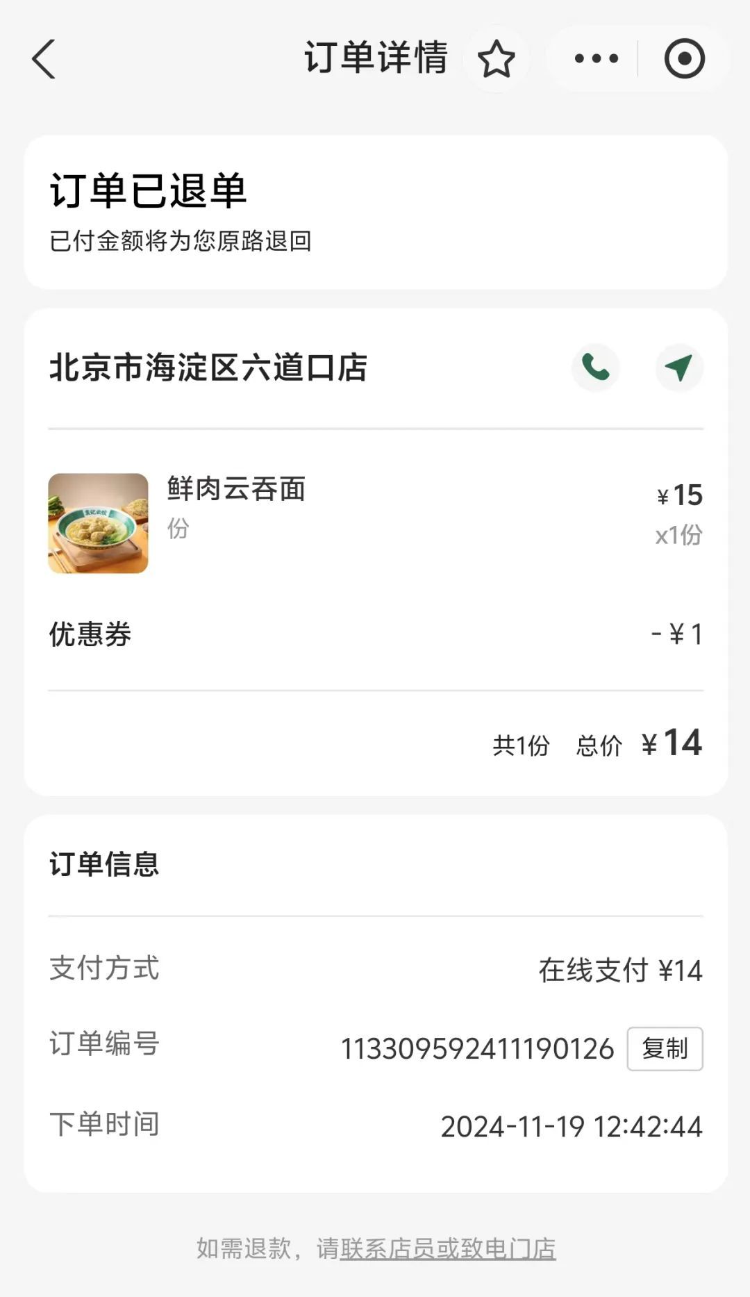 焦先生的订单截图泄漏,商家已退单。