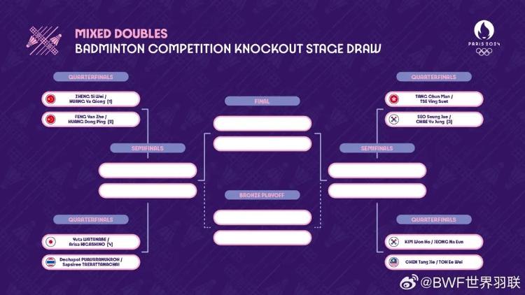 30日凌晨,羽毛球混双表情淘汰赛对阵出炉,两对中国组合郑念念维/黄雅琼和冯彦哲/黄东萍在1/4决赛提前际遇。