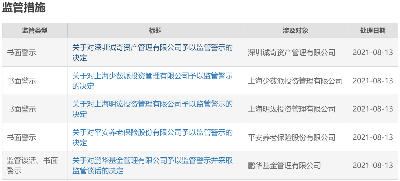 同日,上交所也公开了处理效果,共出具5份监管警示函,包括对1家基金解决公司(鹏华基金)接管监管话语并处书面警示监管阵势,对1家保障公司(祥瑞养老保障)、3家私募基金解决东说念主(明汯投资、少薮派投资、诚奇钞票)接管书面警示监管阵势。
