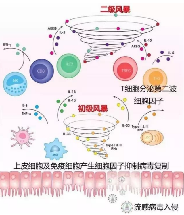 以流感为例,机体免疫系统感应到病毒RNA后,会开动一个快速的信号级联,使受感染的上皮细胞和机体免疫细胞产生约15种细胞因子,匡助回击病毒。其中白细胞介素-6(IL-6)激活免疫细胞(T细胞和巨噬细胞),排除感染病毒的细胞,是这波细胞因子的主力。这第一波细胞因子称为“低级风暴”。随后,T细胞被激活并分化,分泌第二波细胞因子,其中打扰素-γ(IFN-γ)是这波细胞因子的主力。致命的往往是这二级风暴,这时细胞因子水平已超出排除病毒所需。