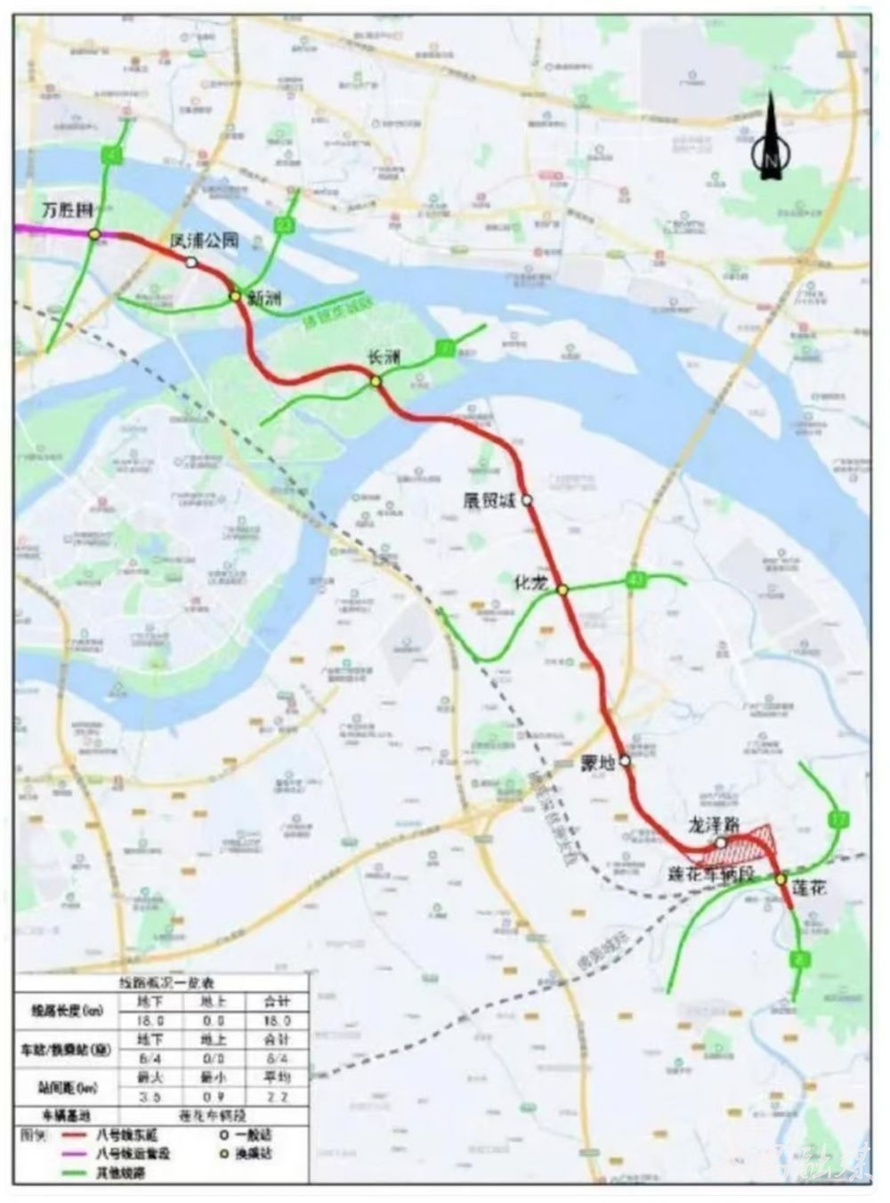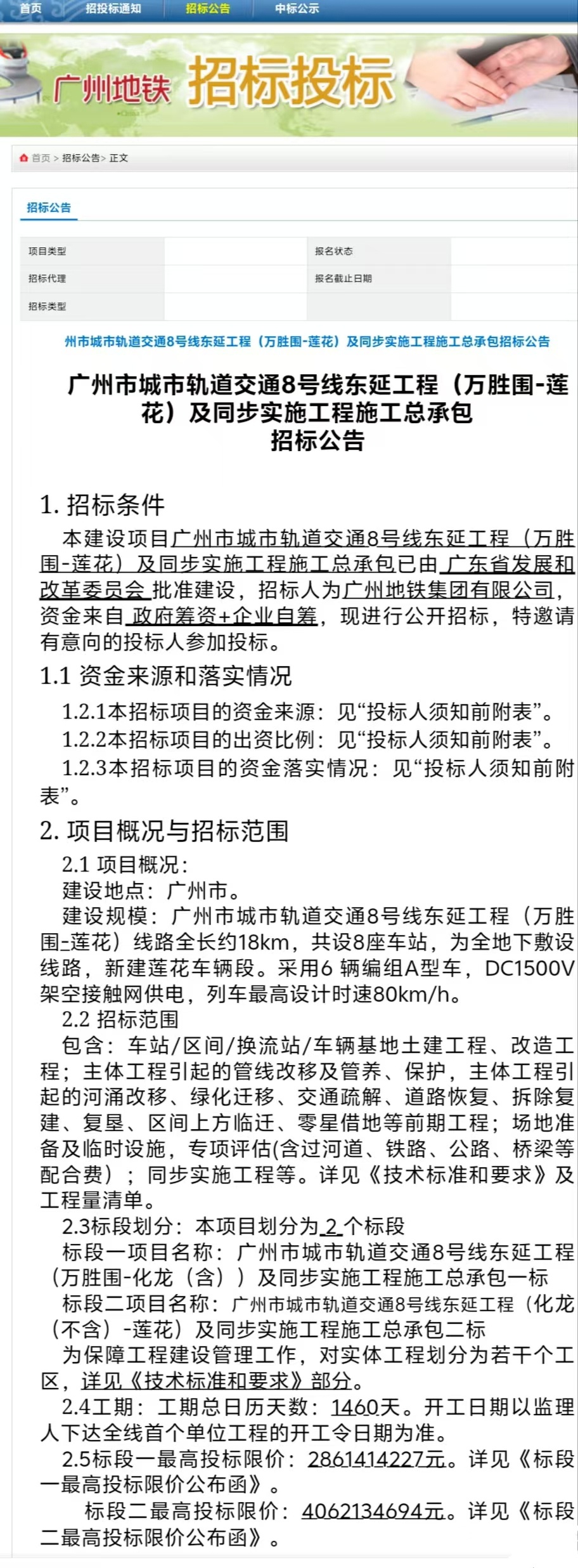 阐发招标公告,广州市城市轨谈交通8号线东延工程(万胜围-莲花)及同步实验工程施工总承包已由广东省发展和鼎新委员会批准缔造,表露全长约18公里,共设8座车站,为全地下敷设表露,新建莲花车辆段。禁受6辆编组A型车,DC1500V架空战役网供电,列车最高盘算推算时速80公里。