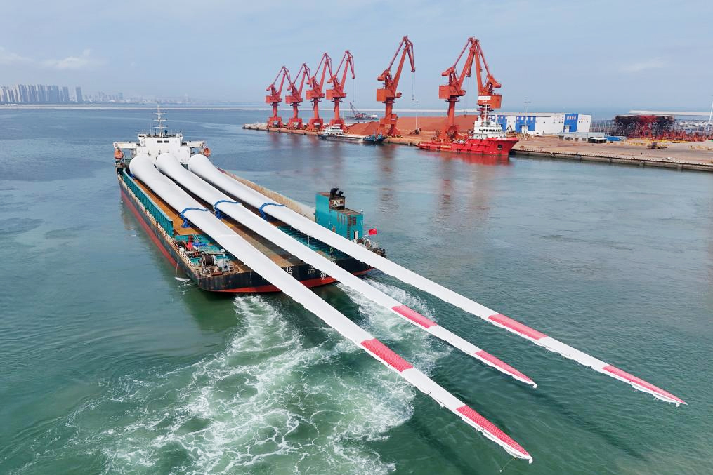 2025年8月1日,超大尺寸海优势电叶片从山东口岸烟台港蓬莱港区起运(无东说念主机相片)。新华社发(唐克摄)
