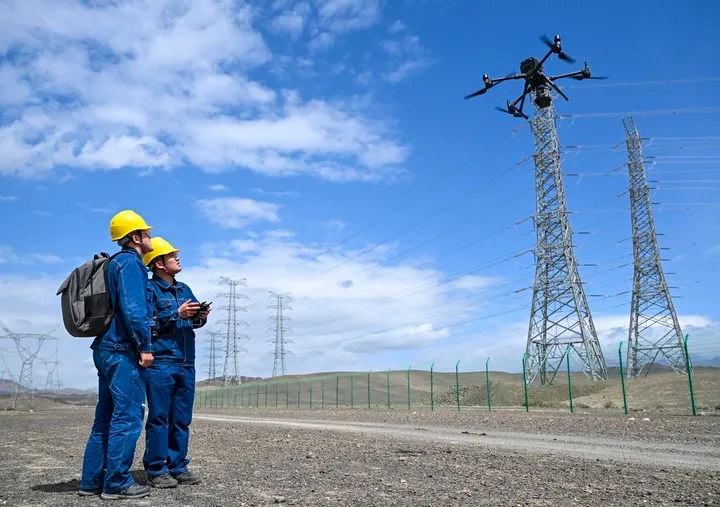 2024年4月25日,在新疆乌鲁木王人市达坂城区,国网乌鲁木王人供电公司输电运检中心的无东说念主机飞手哈依那尔.木那特(右)与共事使用无东说念主机巡查220千伏达清泉输电线。新华社记者陈朔摄