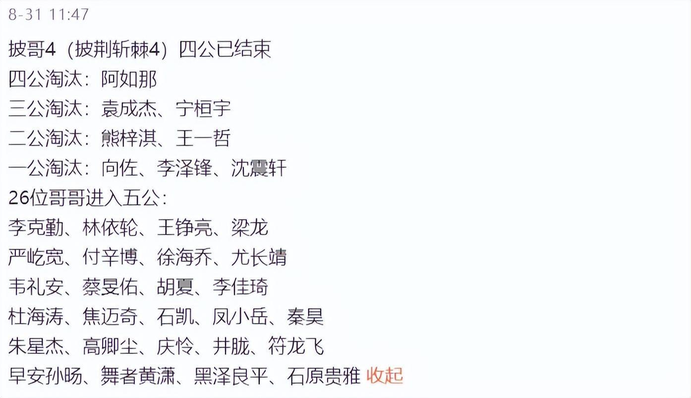 本季节目刚开播,网上就传出前三轮舞台公演被淘汰的哥哥名单,第一轮舞台公演是:向佐、李泽锋、沈震轩,第二轮舞台公演是:熊梓淇、王一哲,通过不雅看节目,咱们也可以降服,网上传出的音信确实度极高。