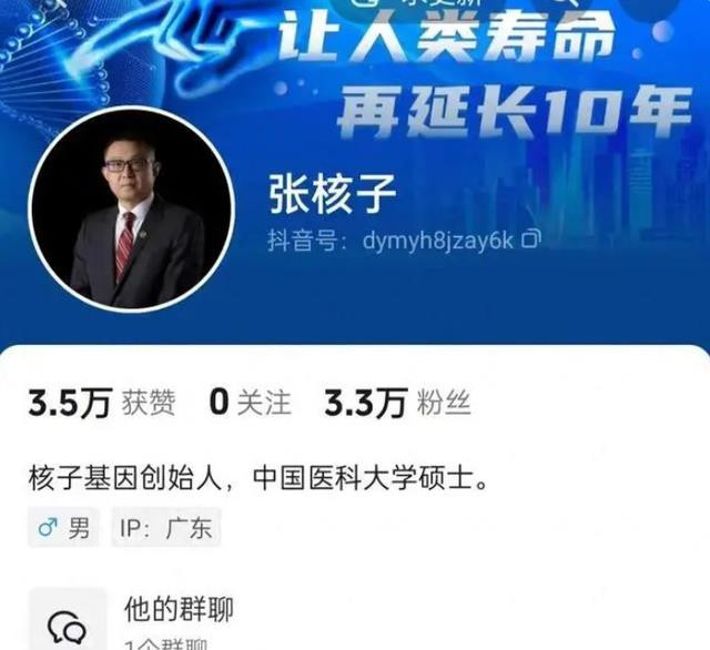 在张核子的抖音账号简介中,独一简短的一句“核子基因首创东谈主,中国医科大学硕士”,除此之外再无其它先容。
