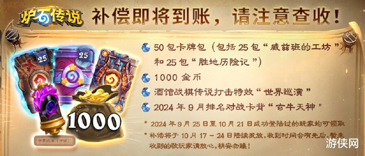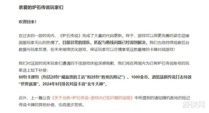 《炉石传闻》官方昨日发布公告示意此前因“列队、匹配与断线”等问题而补充的50包卡牌包抵偿行将到账现金凯发·k8国际app平台,当今还是部分玩家收到。
