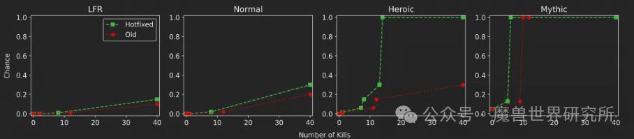 绿色的弧线名义了加强后的掉落,从左到右分裂是随即,庸碌,袼褙,史诗难度的击杀次数与对应的掉落概率,1为100%。