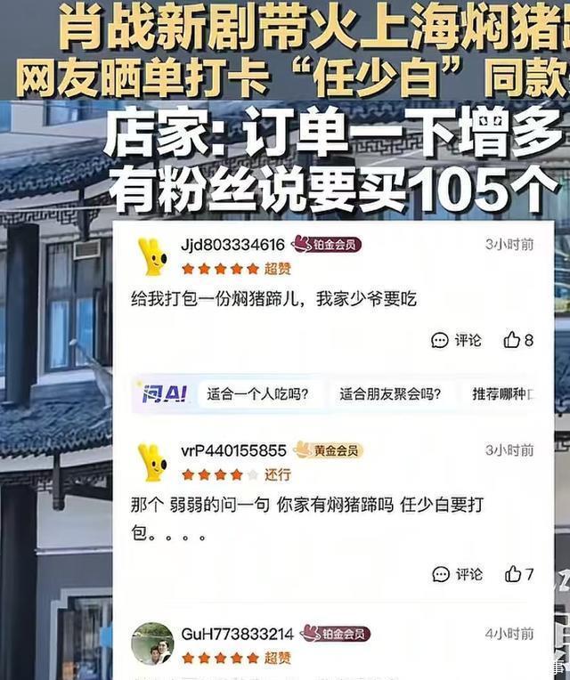 有一个有钱的粉丝,宣称我方要订106个,因为10.5是肖战的寿辰,订106个是我方吃一份,其他的带到现场,这应援真实是太可怕了。 肖战的带货能力照旧一如既往的强到概括啊,况且因为德兴馆又惟有上海有,以致出现了焖猪蹄代购,真实是有点子恐怖啊,径直就写着“谍战上不封顶小白少爷同款”,剧还没爆,以致还没拍完,猪蹄先火了,这带货能力,真实是强到恐怖啊!