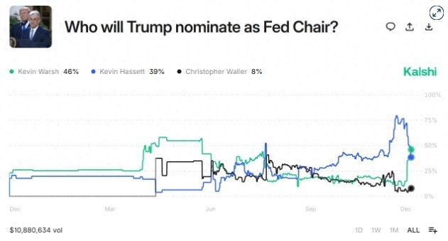 在权衡平台Kalshi上,往复员周一给出的数据炫耀,沃什获提名的概率约为46%,略高于哈塞特的39%。而就在上周,哈塞特的胜算一度高达77%,沃什的概率则低至10%,两东说念主局面在短时老实发生显着逆转。