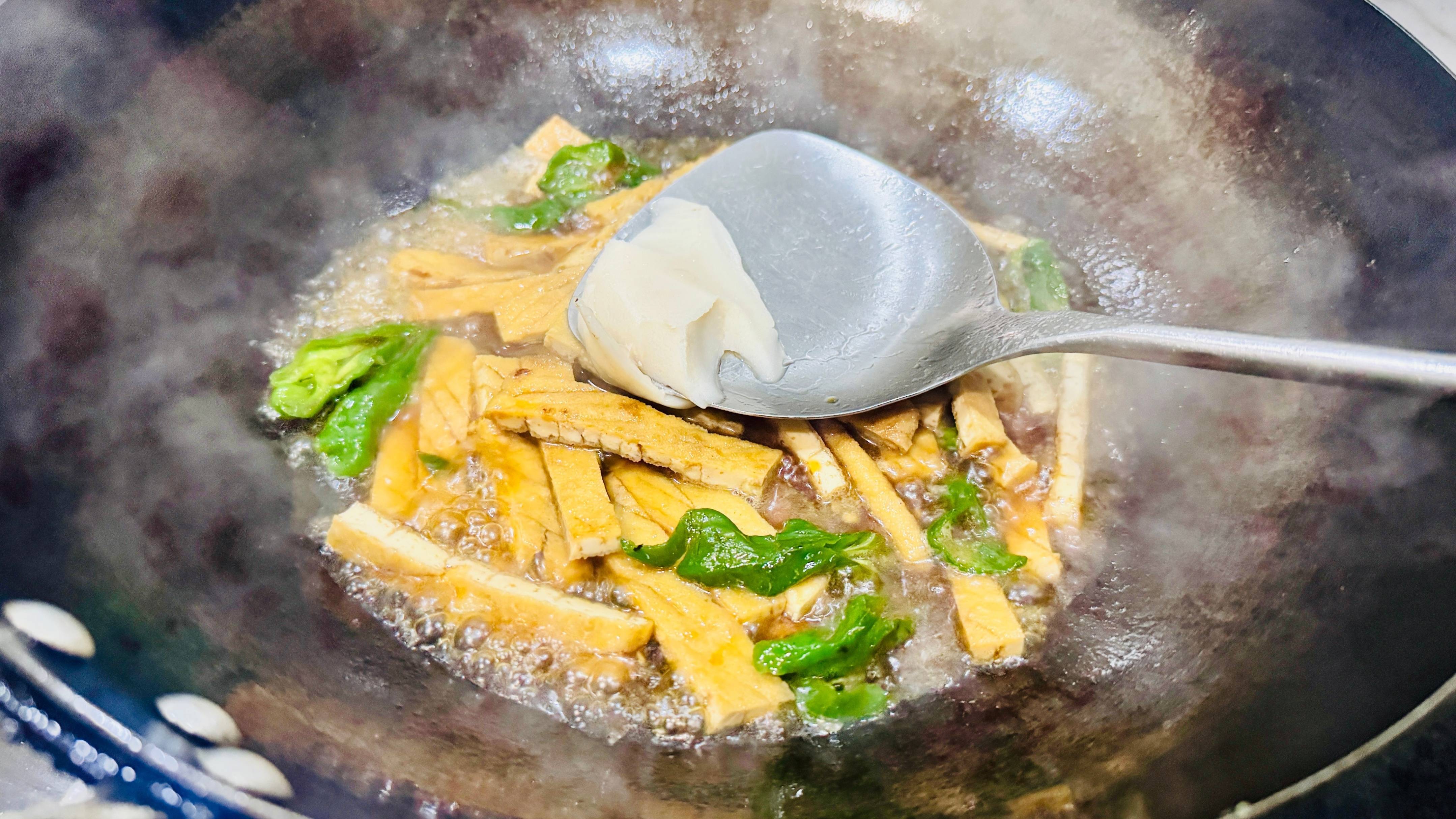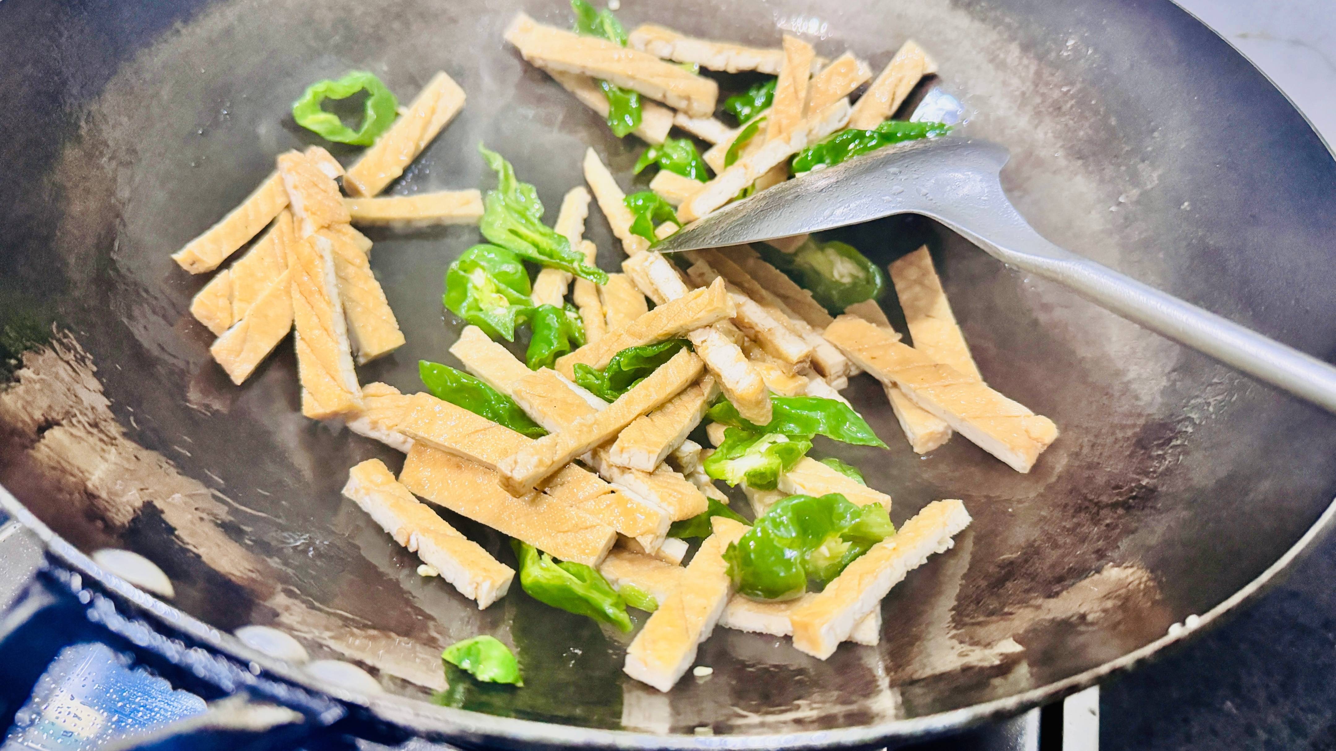 倒入切好的花干。这种是油炸过的,是以炒制的时分并不需要炒太久。