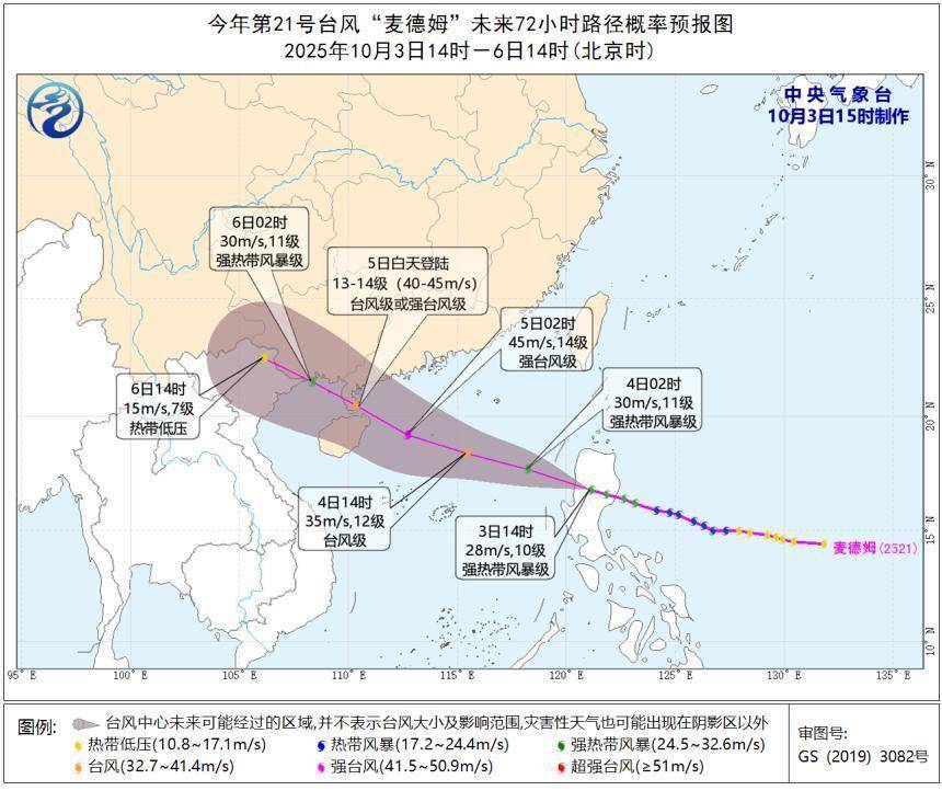 大风预告:3昼夜间至6日日间,广东雷州半岛和中西部沿海、广西沿海、海南岛及沿海、西沙群岛、中沙群岛、黄岩岛隔邻海域将有6到8级风,南海中北部、琼州海峡、北部湾中北部有9到11级风,“麦德姆”中心经过的隔邻海域或地区风力可达12到14级、阵风15到17级。